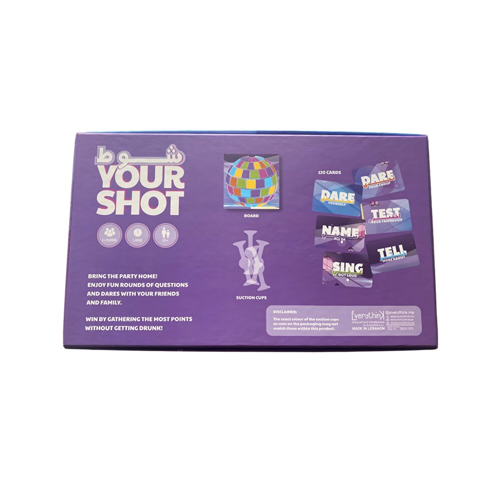 Setup and start playing in seconds with simple step-by-step instructions. Multiple ways of playing for endless fun. Game on any size table! 120 cards game designed to bring you and your friends a great night! Whether you use beer, wine, liquor, juice, or water please drink responsibly. Shoot Your Shot! is proudly designed and manufactured in Lebanon by our Lebanese young designers to bring the most fun to any party. We always strive to provide the best service for our customers.